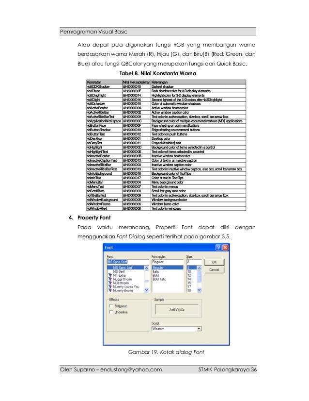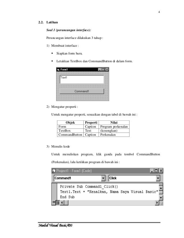 Berikut algoritma yang sudah disusun pada microsoft visual basic. Proses penerjemahan algoritma kedalam bahasa pemrograman disebut. Visual basic 6.0, yang dimaksud dengan properties di bawah ini adalah : Ini adalah versi gratis yang diumumkan pada 2014. Pada microsoft visual basic 6.0, bila ingin menulis program, maka harus berada di :